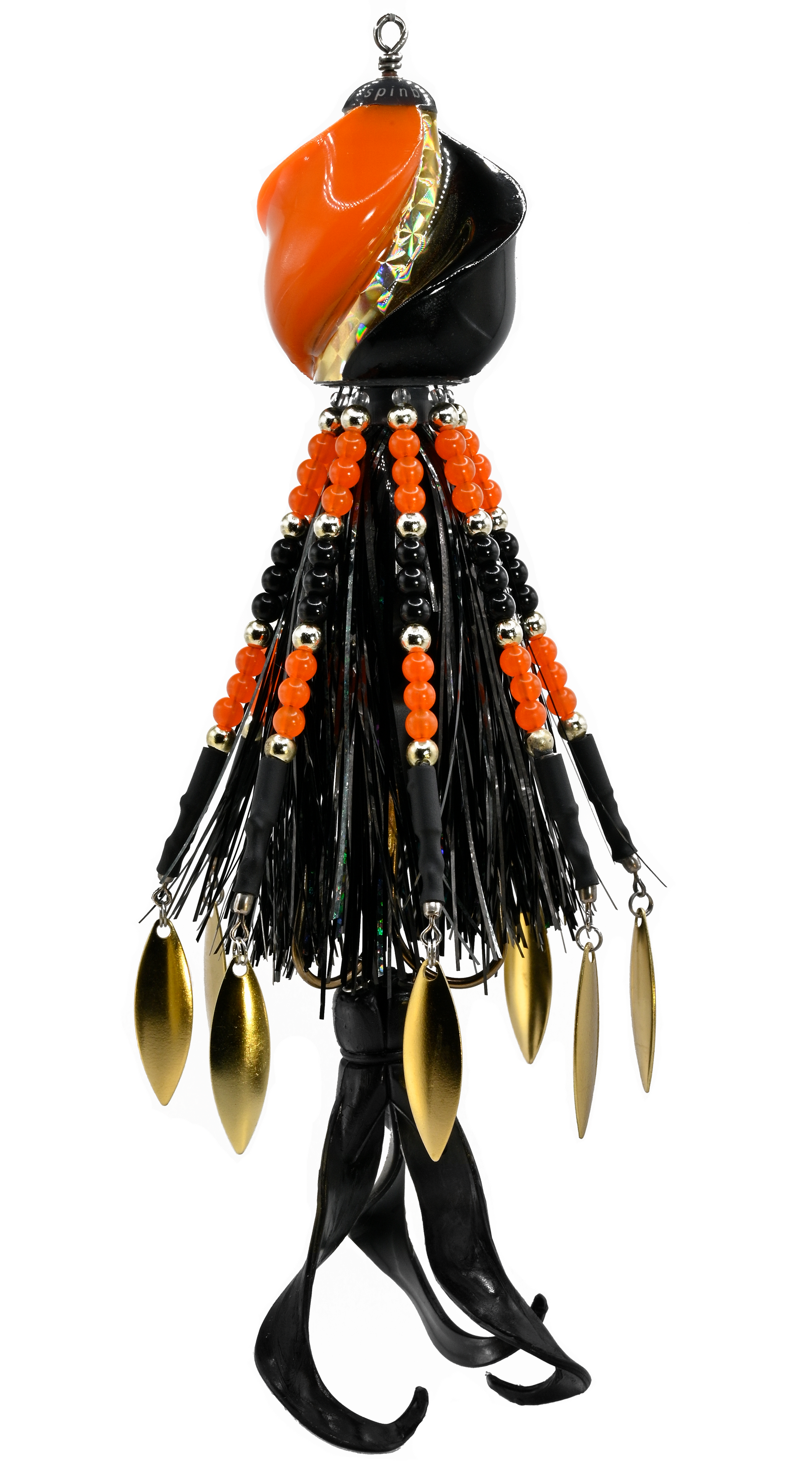Orange and Black head with brass blades. Black tail. 9 in. 3.25 oz.