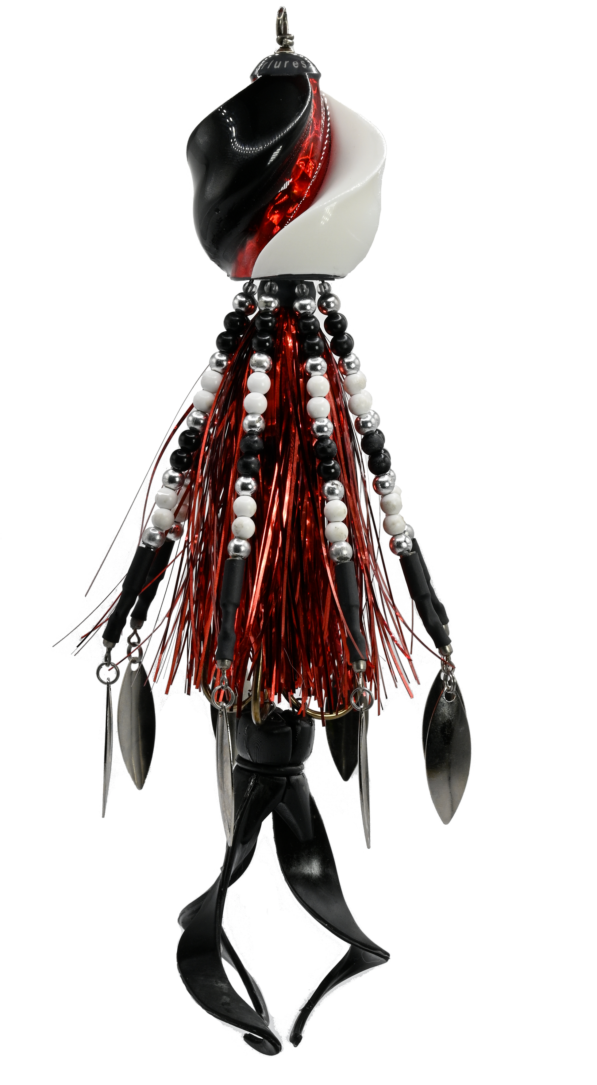 White and Black head with red trim and bright nickel blades. Black tail. 9 in. 3.25 oz.